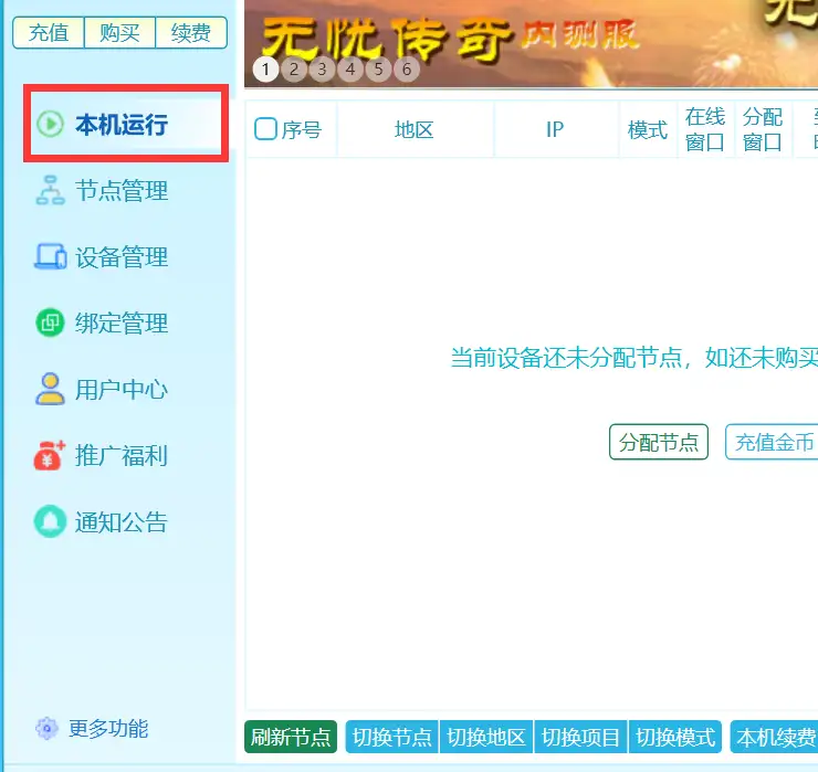 登录后,点击左侧本机运行,可以查看当前设备上已经分配的节点,还未分配节点右边显示的就是空的。