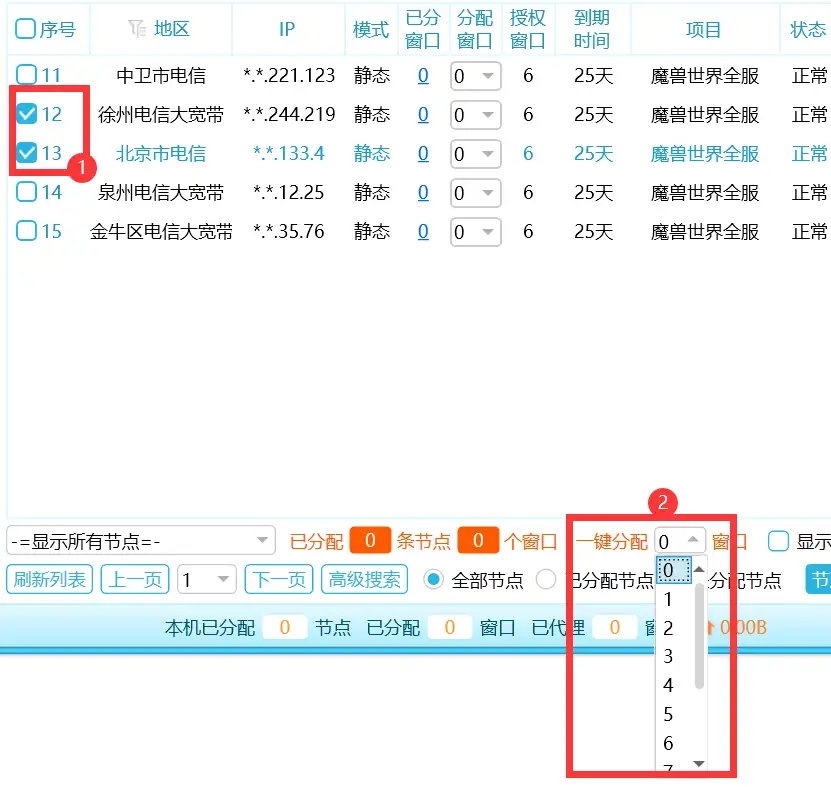 当前电脑需要上4个号,每两个号用一个IP,我们就 勾选2个节点,然后 一键分配 2 个窗口,这样就是每个IP上2个号,2个 IP,总共上4个号。