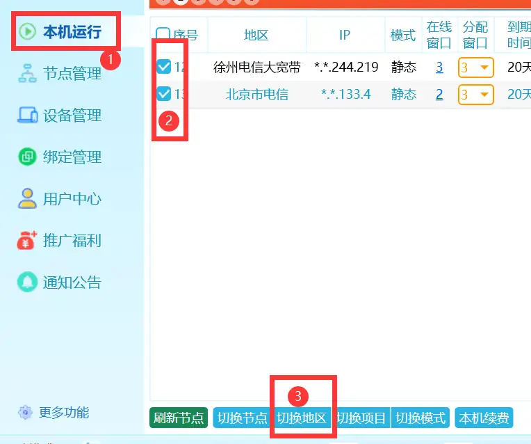 3、勾选右侧节点列表中需要切换的节点