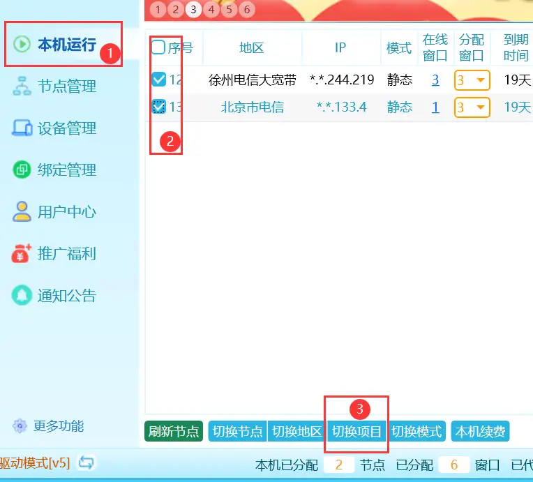 3、勾选右侧节点列表中需要切换的节点
