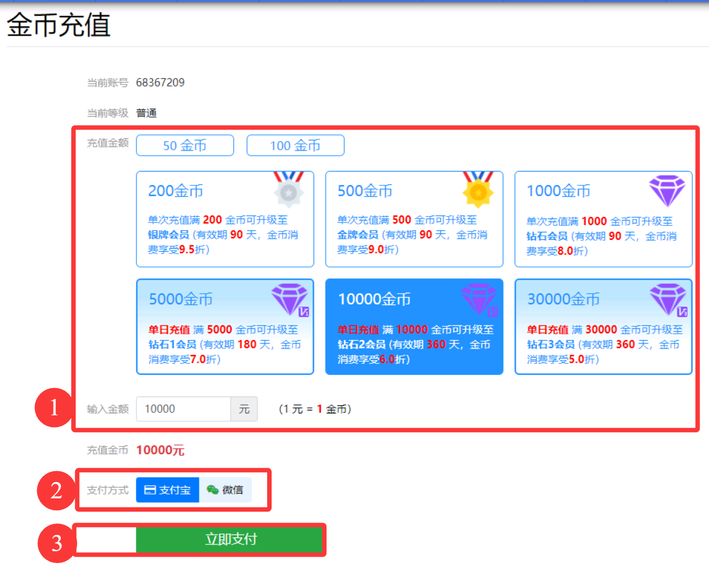 单日充值 满 30000 金币可升级至 钻石3会员 (有效期 360 天,金币消费享受5.0折)