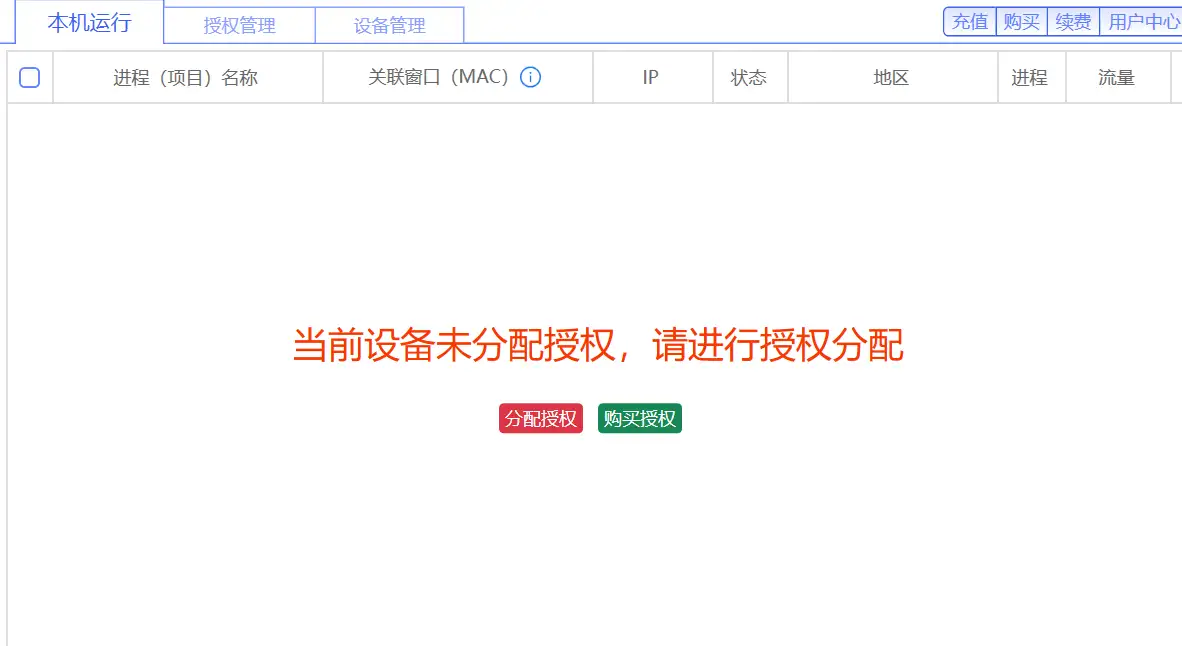 如果 本机运行中 出现这个页面,说明当前设备还未分配授权,需要手动分配授权
