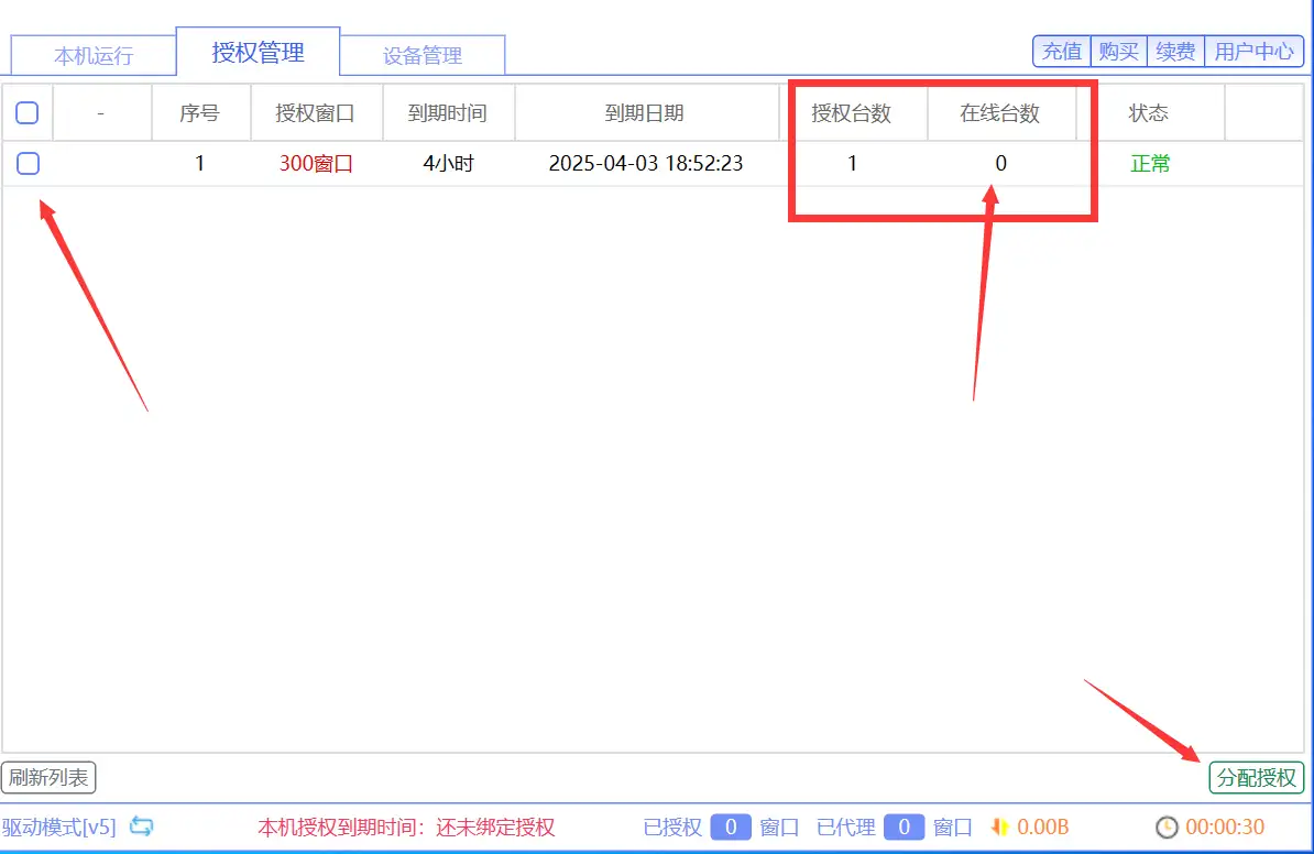 找到需要分配给当前电脑使用的 授权,在线台数 0 或者 小于 授权台数的 说明还可以分配授权。