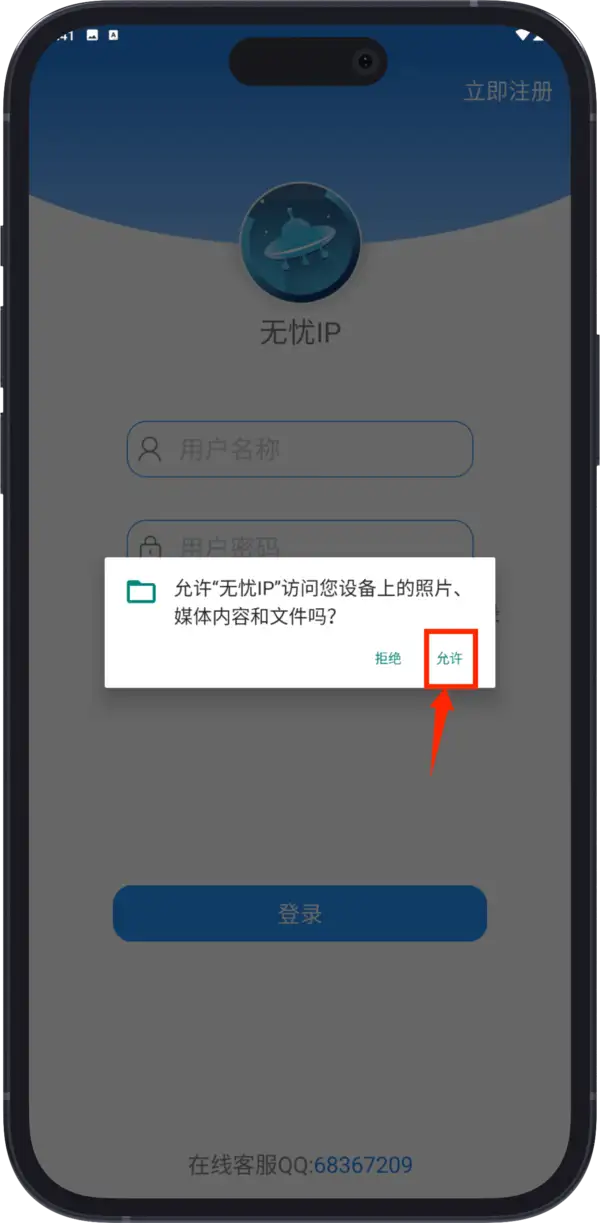 打开 无忧IP APP,第一次打开会提示访问权限,全部允许。