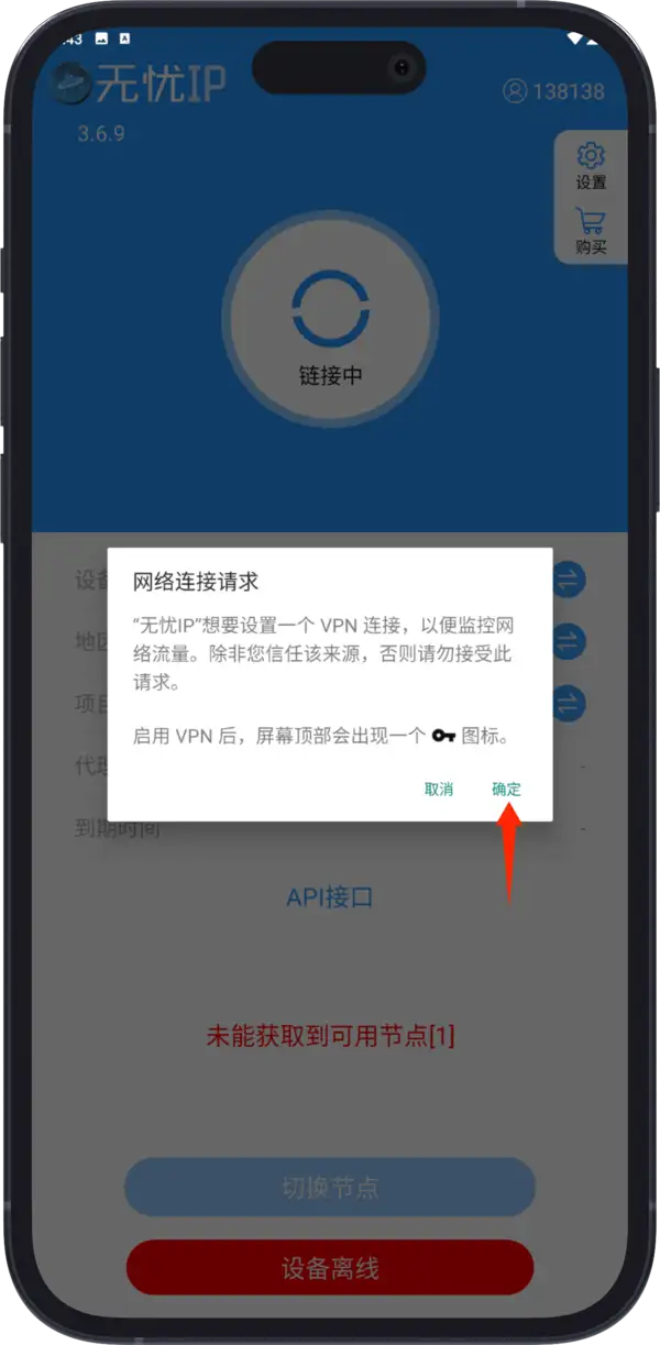 登录后如果已经购买节点,会自动连接,第一次连接会弹出 网络连接请求 的权限,点击 确定就可以了。