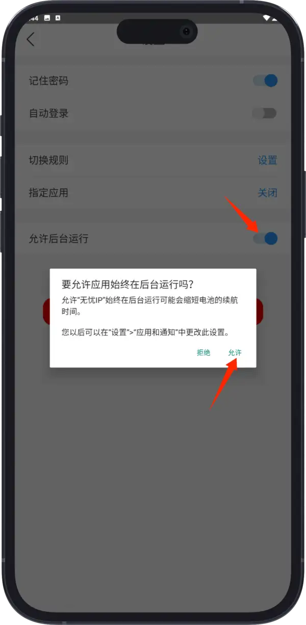 下方 允许后台运行,勾上,弹出提示,点击允许。