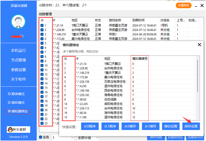 线路ID对应模拟器的ID,一一绑定,避免账号上错导致封号。